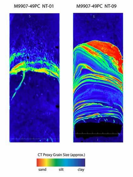 CT scan images of turbidites in deep sea sediment cores. On the left, a thin bed of turbidites from a 1906 earthquake. On the right, from an earthquake about 1,500 years ago, the typical "inverted doublet beds" - a doubling or tripling of turbidite thickness. The thick sand up at the top is the San Andreas bed, with the Cascadia bed down below.