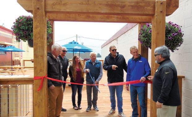 At the park ceremony is from left to right, Chris Schreiber, Brookings City Councilor Isaac Hodges; Brookings City Manager Janell Howard, Brookings Mayor Ron Hedenskog, Brookings Public Works and Development Director Anthony Baron, Mike Horgan of Pacific Coast Properties, and Redwood Theater owner Scott Larson.