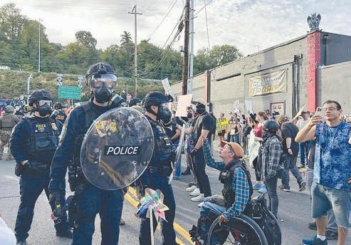 south Portland to protest ICE, the Department of Homeland Security and Trump. Federal police from the Department of Homeland Security, many wearing gas masks and helmets, surrounded the building as protesters yelled “Shame, shame!” and called for them to get out of Portland.