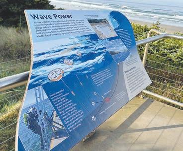 informational sign at Driftwood Beach State Park on the Oregon Coast describes PacWave, the wave energy testing facility that runs under and offshore from the park.