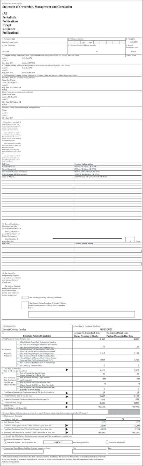 CA 92614 949-252-8300 NPP0477944 To: LINCOLN COUNTY LEADER 10/01/2025, 10/08/2025, 10/15/2025, 10/22/2025 LCL25-518 LINCOLN COUNTY FINANCE Supplemental Budget, Class Display, 5 Columns X 7.5 Inches LCL25-517 IN THE CIRCUIT COURT OF THE STATE OF OREGON FOR LINCOLN COUNTY PROBATE DEPARTMENT. In the Matter of the Estate of SUSAN JANE SCHAFFNER, Deceased. CASE NO. 25 PB 07421 NOTICE TO INTERESTED PERSONS (ORS 113.155). NOTICE IS HEREBY GIVEN that the undersigned