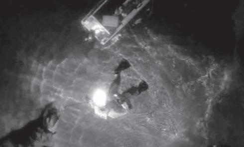 This is a screen shot of the video showing the Coast Guard diver being lowered to the ocean to rescue the captain of the capsized fishing vessel. (Courtesy from the U.S. Coast Guard)