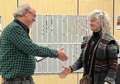 LCSD Board of Directors Chair Peter Vince reaches out to shake the hand of new board member Natalie Schaefer after swearing her in during the regular monthly board meeting October 14, 2025. Schaefer will serve the remainder of Liz Martin’s term which runs through June 30, 2027. (Courtesy photo from the LCSD)