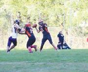 Quarterback Darian Schultz, #11, picks out a pass against Falls City. See more photos with this story at the Lincoln County Leader website. (Courtesy photos from Amber Brown)