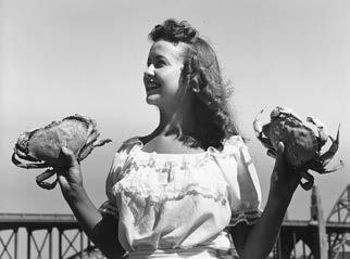 Helen McFetridge holding crabs for a promo shoot for the Crab Festival, 1947.