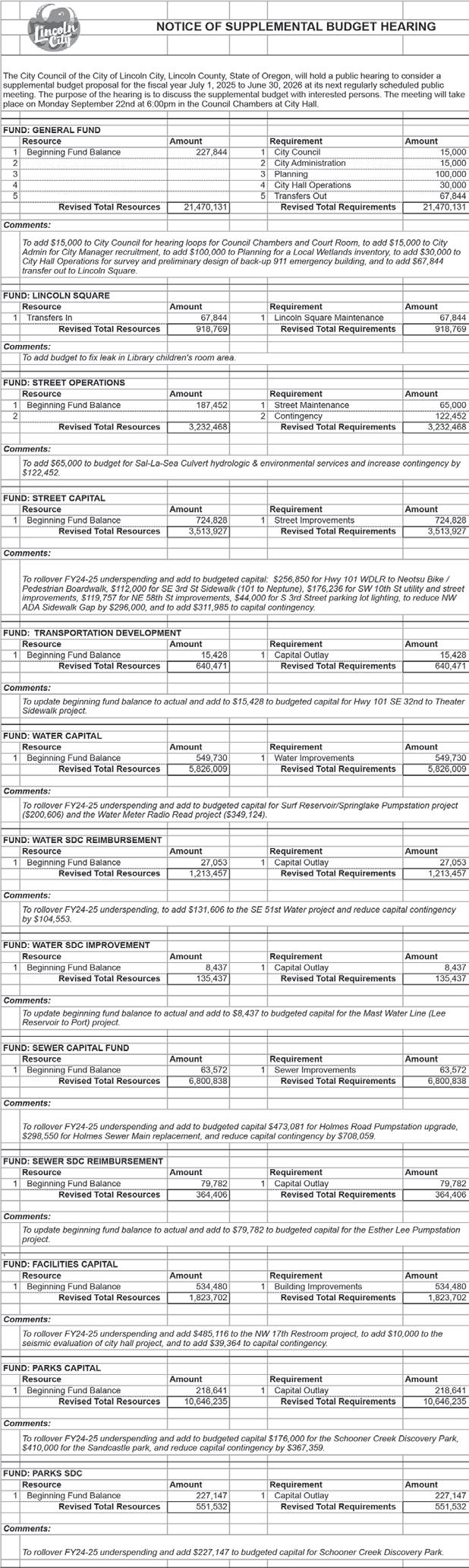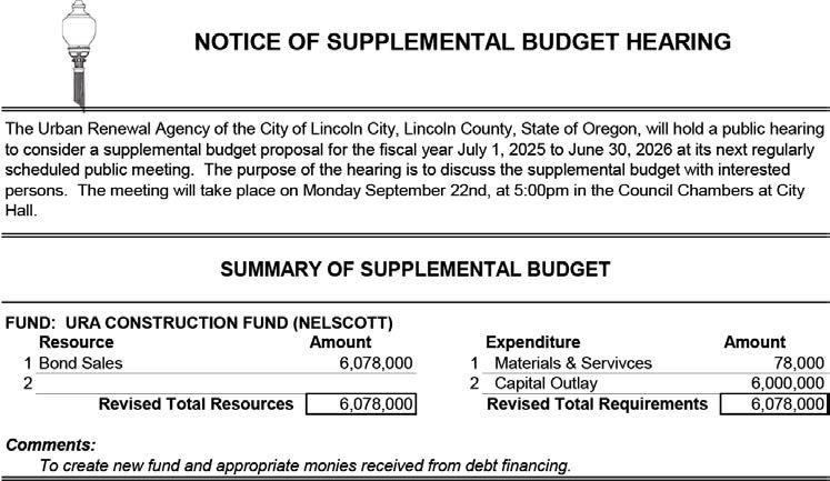LCL25-505 CITY OF LINCOLN CITY-URA Supplemental Budget Notice, Legal Display, 5 columns X 3.5 inches 9/17/25