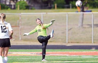 Taft’s goalkeeper Lila Mangold booting the ball against Tillamook. (Courtesy photo from Lon French)