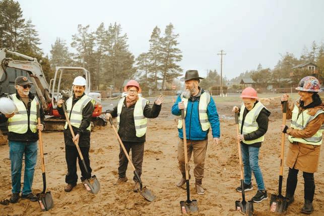 From left to right: Manzanita City Councilors Jerry Spegman and Tom Campbell, Mayor Kathryn Stock, Councilors Brad Har and Linda Kozlowski, and City Manager Leila Aman break ground on the a new police station and city hall on
