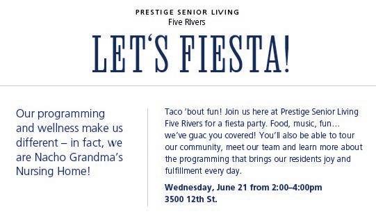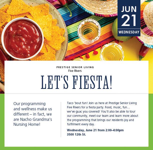 Come experience the fun we have here as we host a fun fiesta on Wednesday, June 21 from 2 – 4 p.m. We’ll have food, music and fun, and you’ll also be able to tour our community, meet our team and learn more about our programming. For more information about our programming, our community or our current move-in special, call us at (503) 842-0918 or visit us online at prestigecare. com/FiveRivers.