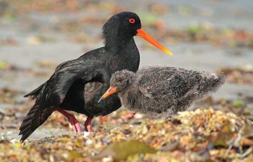 and the scenic offshore rocks that protect them from predators and people. However, tufted puffins aren’t the only amazing bird that relies upon the resources the Oregon Coast provides. The offshore sea stack rocks dotting our coastline support seabirds at every level: Common Murres, the black-and-white “northern penguins” stack themselves by the thousands across the top of rocks. Further down, Western Gulls nest on top of the grasses and Tufted Puffins and Leach’s Storm Petrels (a nocturnal, tiny seabird) live in their dirt burrows. On the vertical cliffs below, large fishingeating Pelagic and Brandt’s cormorants nest on tiny ledges barely large enough to support one bird, much less a growing family. Two more seabird species hide in rock crevices, only emerging to fish: Pigeon Guillemots and Rhinoceros Auklets (a bird whose appearance rivals Tufted Puffins in ridiculousness!). Finally, Black Oystercatchers nest closer to the base of the rocks, often barely higher than the crashing waves. All of these birds depend on the resources provided by our nearshore waters. And that’s just the birds on the offshore rocks! Many other bird species entirely depend on the Oregon Coast, such as the threatened Snowy Plover which nests
