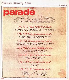 Consideration of the other fellow and ability to admit one’s mistakes are two highly important factors to successful living, according to Parade. In observance of the New Year, the magazine presented a short course in human relations that “should contribute to a happy and prosperous 1972.” More “we” and less “I” was one of the key lessons.