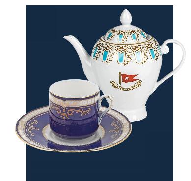 THE WISTERIA PATTERN TEAPOT and the cobalt blue and gold 1ST CLASS CUP AND SAUCER are replicas of china used in the dining rooms and verandah cafes on board the RMS Titanic. Teapot, $35; Cup and Saucer, $20, thetitanicstore.com