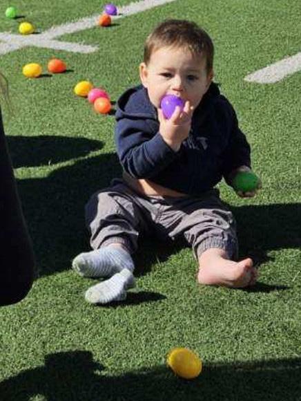 Jason Little, 9 months, hasn’t quite gotten the hang of his first Easter Egg Hunt at the Monmouth Christian Church event Saturday at Central High School. For more Easter photos, go to page B8.