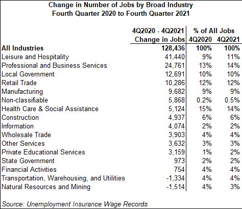 While some sectors lost jobs over the year, most had substantial growth. Nearly one-third (32%) of the large overall job gains occurred in leisure and hospitality. Lei sure and hospitality grew by 41,400 jobs and shifted from making up 9% of all jobs to 11%. Professional and busi ness services – particularly professional and technical services – have also seen strong growth during the jobs recovery. Professional and business services grew by 24,800 jobs and increased their share of all jobs from 13% in the fourth quarter of 2020 to 14% in the fourth quarter of 2021.