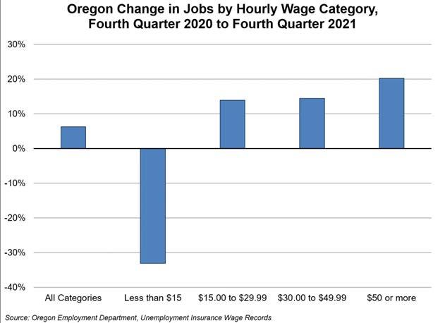 Changes in the distribu tion of Oregon’s jobs was even more pronounced across wage categories. Employ ment moved up the pay scale over the year. Between the fourth quarters of 2020 and 2021, the number of jobs paying less than $15 per hour fell by 125,700, drop ping 33%. At the same time, the number of jobs paying