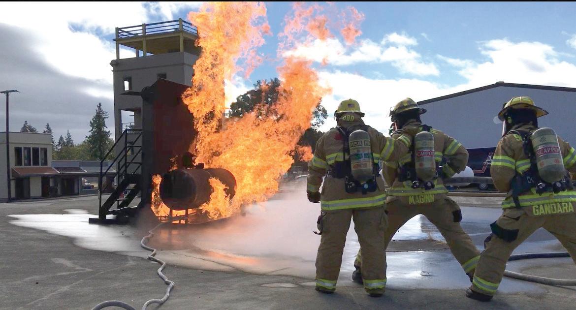 Courtesy of Amy Frigaard Frigaard, pictured on the left, fights a blaze at the CRFR training grounds.