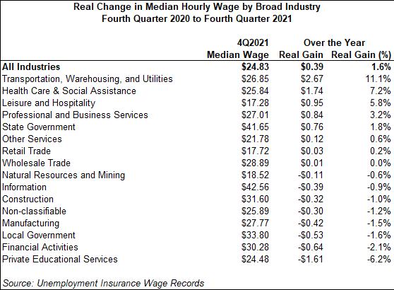 Eight industries saw real wage gains between the fourth quarters of 2020 and 2021. The largest gain occurred in transportation, warehousing, and utilities, which rose by 11% to $26.85 per hour. Health care and social assistance (7.2%)