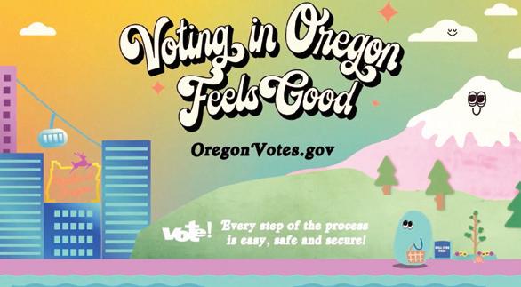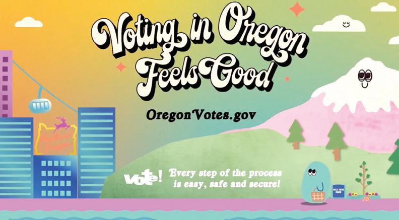 “I want the characters in these videos to be to Oregon elections what Smokey the Bear is to wildfire preven tion,” Fagan said. “This campaign is as fun as it is informative, with Oregonfocused animations that stand out from other government messages. When you see the videos and social media posts, I hope you’ll take a moment to remember why Oregonians are very proud of vote-bymail.”