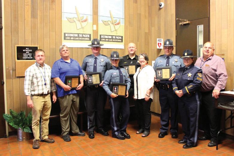 Displaying the awards are, from left, Columbia County Commissioner Casey Garrett, Grumpy’s Towing employee Jay White, OSP Trooper Chris Cowen, Trooper Grace Davey, Sheriff Brian Pixley, Columbia County Commissioner Margaret Magruder, OSP Sgt. Chad Drew, OSP Superintendent Terri Davie, Columbia County Commissioner Henry Heimuller.
