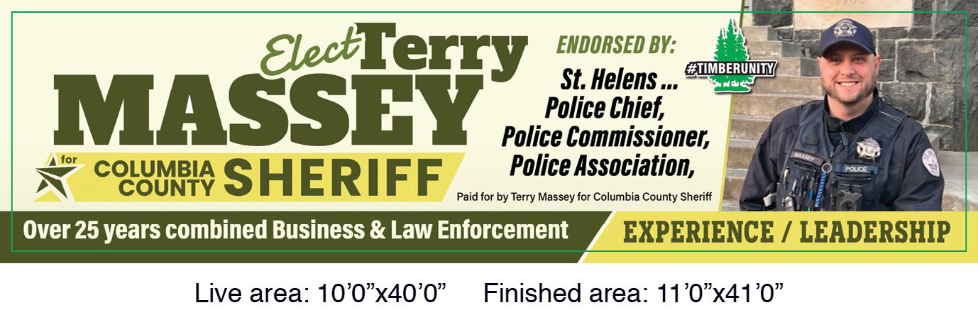 Serving the Lower Columbia Region since 1891 VOL. 131, NO. 25 $1.50FRIDAY, OCTOBER 28, 2022 Election 2022 Page A2 TERRYMASSEY4SHERIFF.VOTE Collaboration Communication Accountability electkellyniles.com Paid for by Elect Kelly Niles ID # 21881 Obituaries ................. A3 Election 2022 ........... A2 Opinions ................... A4 Classified Ads ......... A5 Legals ....................... A5 Community Events . A6 Phone: 503-397-0116 Fax: 503-397-4093 chiefnews@countrymedia.net 1805 Columbia Blvd., St. Helens, OR 97051 Contact The Chief