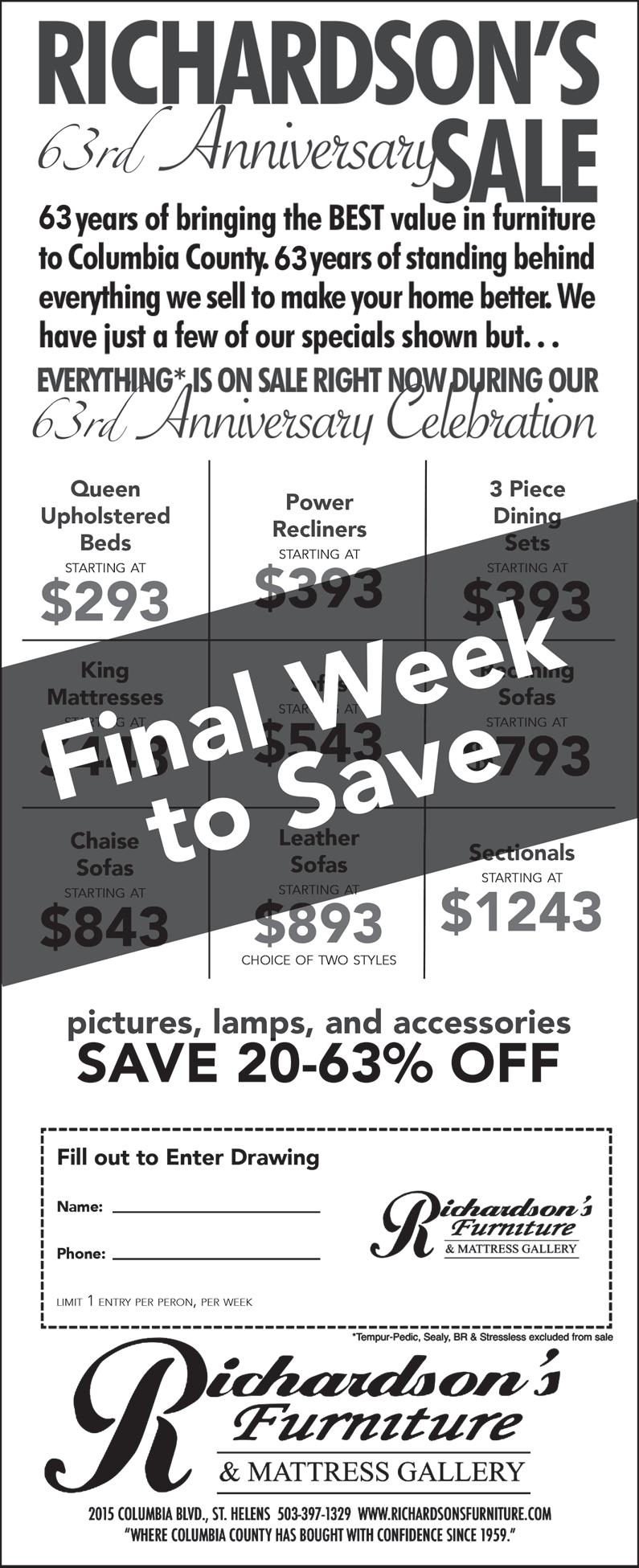 ACROSS 1. Tart spicy quality 5. *Senators each repre sent an area on it 8. Jamaican rub 12. Succulent medicinal plant 13. Tiny piece 14. Home to Burj Khalifa 15. Sail support 16. Sensory input 17. Bedazzle, e.g. 18. *One making SCO TUS nominations 20. Grape holder 21. Japanese cartoon 22. Drunkard’s sound? 23. *First Lady, acr. 26. Singer, songwriter, musician Jon ____ 30. Stumblebum 31. Kind of monkey 34. In a little while, to Shakespeare 35. Speedily 37. M in rpm, abbr. 38. North face, e.g. 39. Toy brick 40. Typical revolver 42. “The One I Love” group 43. The ____ Man, inter net meme 45. Table linens 47. Wow! 48. Instruct 50. Delhi draping dress 52. *#18 Across’ branch of government 56. Shipping weights 57. Three blind ones 58. Field worker 59. Spot for FitBit 60. Defender of skies, acr. 61. Actor Wilson 62. Bookie’s number 63. Wilbur’s home 64. Back of the neck DOWN 1. Pack down 2. Resembling wings 3. Rudolph’s beacon 4. Reaches (2 words) 5. Computer accessory 6. Do penitence 7. Chipper 8. *SCOTUS’ branch of government 9. Jet black 10. Steak option 11. Kith partner 13. In style 14. Part of affidavit 19. Harden 22. Owns 23. Mare’s babies 24. Spot for boutonniËre 25. Allowed into a bar (2 words) 26. Plug for a barrel 27. Zzzz 28. Drinker 29. Opposing military force 32. Arabian chieftain 33. *U.S. Senator’s term, in years 36. *Legislative assembly with power to declare war 38. Mix-up 40. Monkey ____, monkey do 41. United Nation’s children-benefiting org. 44. Type of believer 46. Kaa of “The Jungle Book” 48. Be 49. Tooth trouble 50. Deep-red variety of chalcedony 51. Bone-dry 52. Outback birds 53. Between Minnesota and Missouri 54. *Same as V.P. 55. European sea eagle 56. *U.S. Representative’s term, in years STATEPOINT CROSSWORD THEME: CIVICS 101 Solution to crossword in next week’s issue of The Chief. • •C rossword p uzzl E • • buy and sell in the classifieds Call The chief at 503-397-0116 to place your ad today! check the classifieds online at www.thechiefnews.com to find your perfect job offer Need a job? The Public Notice deadline is Wednesdays by noon. Late submissions are not guaranteed to make it into the paper. 1805 Columbia Blvd, St. Helens www.thechiefnews.com 503-397-0116 The Chief Read the news online Submitted photos must be 3.5 mb or larger, 300 ppi., in .jpg format, and be able to fit into a 10.5 x 8 space. Photos that do not meet these requirements may be rejected or replaced. Submit your photography is Nov. 10 The Chronicle and The Chief are publishing the 2023 Columbia County Calendar and we want to showcase your photography! Only 14 photos will be chosen. Submit your photo to chronicleclassifieds@countrymedia.net for consideration. Please include name and phone number. If selected, you will receive five free calendars along with recognition on the calendar page. The Chronicle 1805 Columbia St. Helens, 97051 • www.thechronicleonline.com www.thechief Sherry Ulin Davis Dwaine Charbonneau Reinke Kimberley Zechmeir Anthony Krueger Raul Chris Ann Dwaine Charbonneau Giovanni Jarquin IMAGES OF COLUMBIA COUNTYCALENDAR The ChiefThe Chronicle & IMAGES OF COLUMBIA COUNTY 2022 CALENDAR ATTENTION Columbia County Photographers