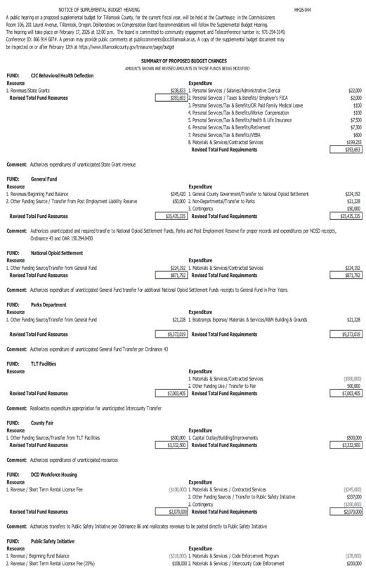 HH26-046 NOTICE OF LIQUOR LICENSE APPLICATIONS. Pursuant to Tillamook County Ordinance #23, the following businesses are undergoing the annual review of their liquor license: Nestucca Valley Sporting Goods. Written comments will be accepted by the Liquor License Review Administrator until 5:00 p.m. on Tuesday, February 17, 2026. All comments must be signed and must specify the business for which the comments are to be made. These comments will be considered in conjunction with the review of the application for a local recommendation to the OLCC. Please direct all comments to Tillamook Environmental Health, 2111 8th Street, Tillamook, Oregon 97141.