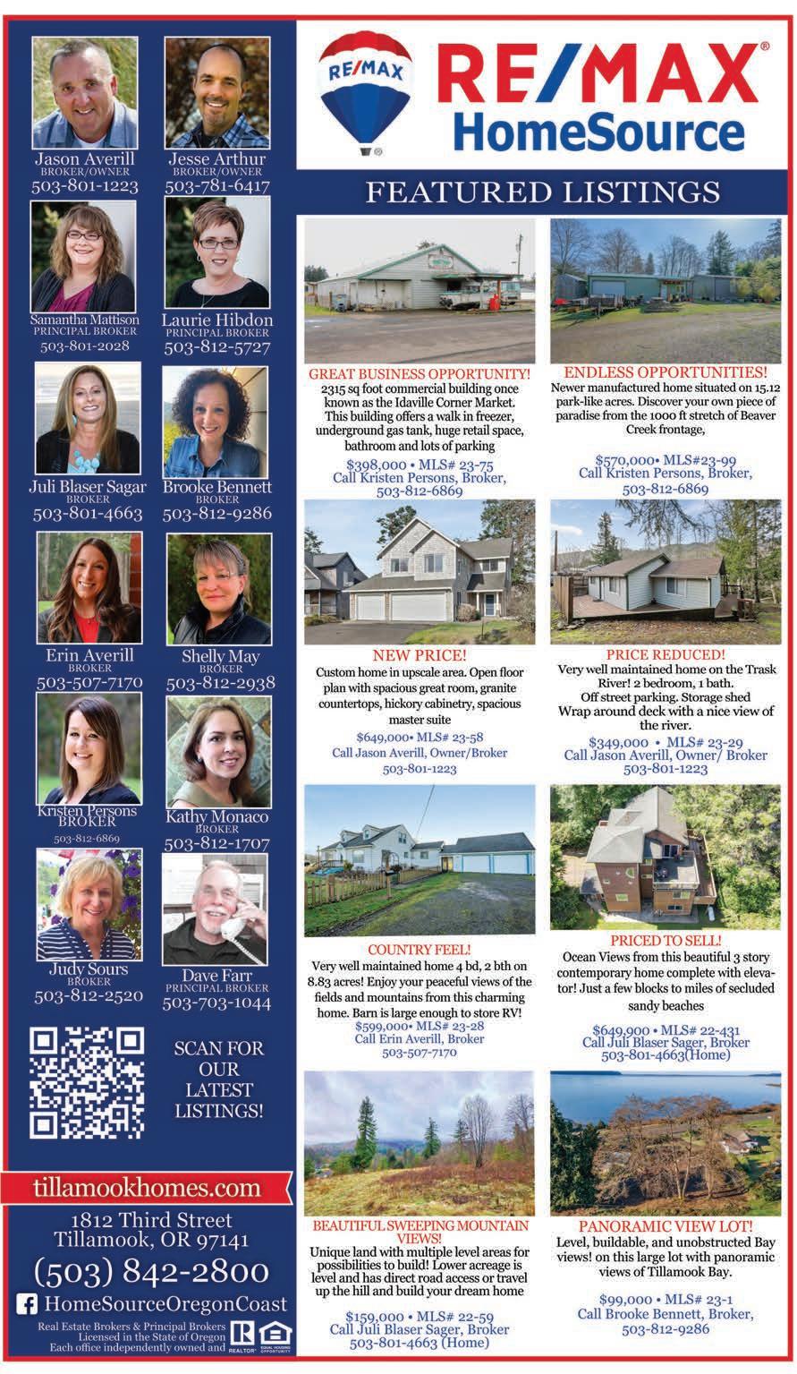 Service • Furnaces • Heat Pumps Call, email or stop by the office today to set up an appointment. FREE ESTIMATES! 503-842-7765 “A Tillamook Family Tradition since 1974” Licensed • Bonded • Insured CCB#144376 customerservice@pandlheating.com 2711 3rd Street • Tillamook, OR H43805 ADVERTISE YOUR BUSINESS HERE Call 503-842-7535 or email headlightads@ countrymedia.net for details Cell (503) 812-2520 judysbythesea@gmail.com 1812 3rd St, Tillamook, OR 97141 Judy Sours HomeSource H20145