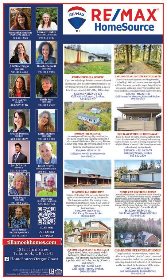 A16 Tillamook Headlight Herald • April 2, 2024 Public Notices 999 Public Notices 999 Public Notices 999 Public Notices 999 Public Notices 999 Public Notices 999 2507 Main Ave. N. Suite A Tillamook, OR. 97141 KING REALTY KING REALTY All land or lots, offered for sale, improved or unimproved are subject to land use laws and regulations, and governmental approval for any zoning changes or use. VIEW MORE PROPERTIES @ www.KingRealtyBrokers.com (503) 842-5525 www.KingRealtyBrokers.com H23486 Call Marilyn Hankins, PC, GRI, CRS, Principal Broker @ 503.812.8208 Or Dylan Landolt, Real Estate Broker @ 503.457.8725 Call Dylan Landolt, Real Estate Broker @ 503.457.8725 Or Marilyn Hankins, PC, GRI, CRS, Principal Broker @ 503.812.8208 Call Dylan Landolt, Real Estate Broker @ 503.457.8725 Or Marilyn Hankins, PC, GRI, CRS, Principal Broker @ 503.812.8208 Call Dylan Landolt, Real Estate Broker @ 503.457.8725 Or Marilyn Hankins, PC, GRI, CRS, Principal Broker @ 503.812.8208 4520 Salmon Street, Bay City, OR 97107 MLS#24-17 $822,000 19TH CENTURY BAY FRONT CHARMER! A unique opportunity to own a very well maintained 1880s home on nearly one acre of Bay Front property. On the property you’ll find a work shop, plus a yurt which is being used as a successful short term rental. The home was remodeled in 2012, however you’ll still find many of the original features, such as the stained glass entry way doors, window/door trim work and more. Downstairs you’ll find a very spacious master suite, while upstairs you have 3 bedrooms plus a half bath. Propane fire place and ductless heat pump in the living room ensure that you’ll stay warm on the cold winter days. The yurt is complete with a full kitchen, bathroom, propane fireplace and hot tub. Amazing views of Tillamook bay and all it has to offer! Call today for more details! 238 S Easy Street, Rockaway Beach, OR 97136 MLS#24-67 $428,999 Come live on Easy Street in a fully furnished serene forested beach house that echoes with the soothing melody of waves. Boasting a remarkable 4.98 out of 5 rating on Airbnb from almost 400 reviews! Rental licenses are now capped in this area but this rental license can be transferred! Or, come live at Easy Street and not have to bring anything with you! Among its standout features are an ocean peek off the front deck, central heating/air conditioning, a conveniently built-in garage equipped with a Tesla charger, 3 expansive decks, and ample RV parking. Currently, this property thrives as a sought-after Airbnb, offering an exceptional stay experience. A fantastic opportunity as a primary residence, income generation or as your exclusive coastal hideaway. Nestled in the heart of Rockaway Beach. Recent updates have elevated its allure, including luxurious vinyl plank flooring, a brand-new kitchen with top-tier stainless steel appliances, granite countertops, bling backsplash and a delightful breakfast bar. The home comes fully furnished and holds a valid short-term license with the City of Rockaway. Be the next owner of this coastal haven! 34460 Bridge Street, Cloverdale, OR 97112 $309,900 23-519 Charming home located in the heart of Cloverdale! Listed below Tillamook County real market value. Many upgrades have been done to this 1920s home such as luxury vinyl plank flooring, 2 ductless heat pumps and more. 3 bedrooms upstairs plus a bonus room downstairs which is currently being used as an extra bedroom. The large fenced backyard works great for kids and pets. Plenty of extra storage throughout the home and in the garage. Great investment opportunity as well as a good option for first time homebuyers. The home’s conveniently located a short drive to the beaches of Pacific City. Call today to schedule a showing! 3413 Maple Lane, Tillamook, OR 97141 MLS#22-340 $875,000 Great investment opportunity! This is your chance to own a nice duplex, a well maintained home, and a double wide manufactured home. 3501 is the duplex built in 2003 with a total of 1860 sq ft (930’ per unit). Rents are $1,250 & $1,150 per month. 3413 is an older home built in 1930, updated to the 70’s with 1966 sq ft and 4 bdrms, 2 baths. Rent is $1250. The back unit, 3417 Maple is a 1999 manufactured home w/ 2 bdrm, 2 bath and is a separate parcel w/ driveway access between the two units in front. Rent for the manuf home is $1,350 per month. Seller pays sewer, water and garbage for all units. Front parcel is .24 ac and back parcel is .09 for a total of .33 acre. Requires 24+ hours for showing appts. PRICEREDUCED