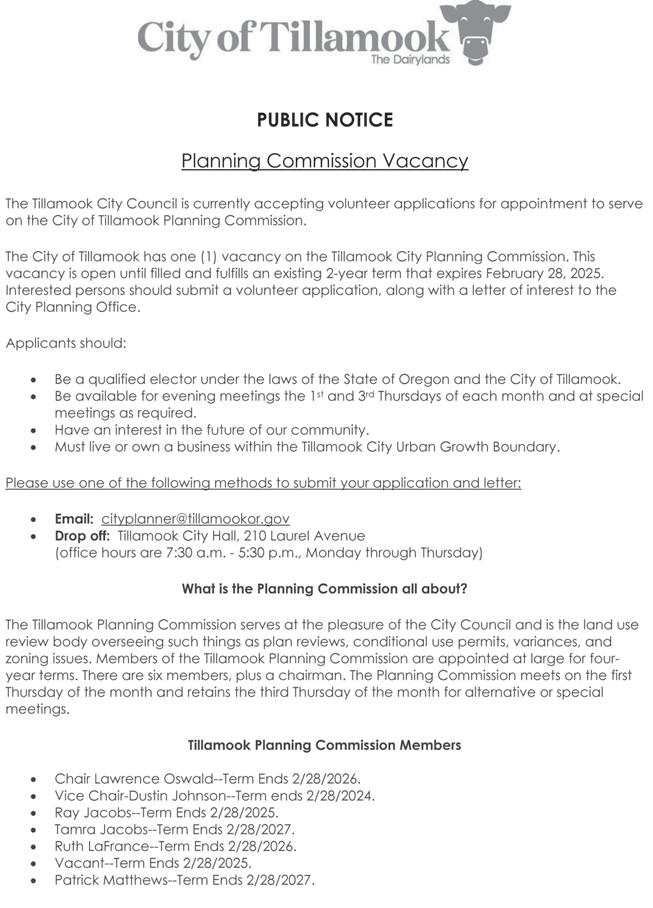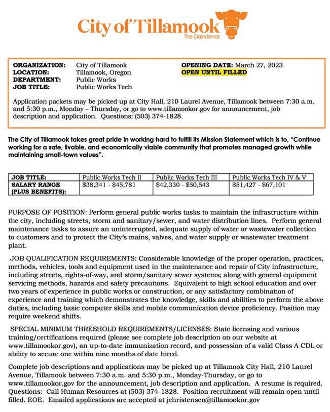 held at Netarts Fire Hall, 1235 5th Street Loop, Netarts, OR. The meeting will take place on April 17, 2023 at 6:00 p.m. The purpose of the meeting is to receive the budget message and to receive public comment on the budget. This is a public meeting where deliberation of the Budget Committee will take place. Any person may appear at the meeting and discuss the proposed programs with the Budget Committee. A copy of the budget document may be inspected or obtained on or after April 12, 2022 at 4970 Crab Ave W, between the hours of 9:00 a.m. and 4:00 p.m. Public Notices 999 Public Notices 999 Public Notices 999 Public Notices 999 Public Notices 999 Public Notices 999 Plumbing License #219524 waldropconstructionllc@gmail.com Jacob Waldrop owner/operator 807 4th St. Tillamook, OR 97141 503-750-1638 •New construction •Remodels •Interior trim & moldings •Windows, doors & siding •Flooring •Decks & patios H21434 Construction Roofing Highlight of the Week Business Service Directory & Real Estate Kourtnie Zwald (503) 801-0272 Odger Rawe Jr. (503) 260-0534 Carolyn Decker cell (503) 801-0935 42 years of personalized service and professional representation. Your patronage is never taken for granted. Our aim is to please and satisfy your real estate needs. WE CARE! 615 Main Tillamook (503) 842-8271 MEMBER OF BETTER BUSINESS BUREAU E-mail: 2deckerrealestate@gmail.com www.deckerrealestate.net H20610 H43646 • Barkdust (Fir & Hemlock) • Bark Nuggets • Red Rock • Compost • Potting Soils • Flagstone U-Haul or Delivered 5755 Alderbrook Loop Road 503-801-1214 or 457-6023 H40846 CCB#202914 Engineering H40844 20 Years Experience in Tillamook County 503-801-6016 Recycling and Auto Facility Don Averill Recycling Auto Facility H40973 Certified Dismantler Serving Tillamook County 503-457-6023 503-842-4588 Flooring Astro &Odie FREE ESTIMATES MARMOLEUM•LAMINATEFLOORS CORKFLOORING•BAMBOO RECYCLED(Polyethylene)CARPETS WOOLCARPETS•CERAMIC/PORCELAINTILE NATURALSTONETILE OpenTuesday-Friday10-5•Saturday10-4 653ManzanitaAvenue•ManzanitaCCB#128946 N20571 503-368-5572 H64713 36180 HWY 101, Manzanita • CCB#128946 MARMOLEUM • LAMINATE FLOORS CORK FLOORING • BAMBOO RECYCLED (Polyethylene) CARPETS WOOL CARPETS • CERAMIC/PORCELAIN TILE LUXURY VINYL FLOORING Computers Tillamook Computer Sales Service Solutions Apple 503 815 8433 TillamookComputers.com Droid Gilbert Davis M.C.S.E. A VETERAN OWNED BUSINESS Insurance Auto/Home/FArm CommerCiAl/WAterCrAFt r eCreAtionAl VeHiCle Safeco Insurance Company Liberty Mutual Oregon Mutual • Progressive • Foremost Locally owned and operated since 1953 1700 FourtH Street • P.o. Box 298, tillAmook 503-842-4407 TONY VELTRI INSURANCE SERVICES H49694 ProteCt Your Future Electrician Heating & Sheet Metal H40971 Haltiner Heating Tillamook Fireplace 503-842-9315 503-842-5653 1709 1st Street • Tillamook • www.haltinerheating.com Open Mon-Fri 8am - 4:30pm • Sat 10am - 2pm • Traeger BBQ’s & Accessories • Custom Flashing • Continuous Gutters • Trane Heating Systems • Mitsubishi Ductless Systems • Wood, Pellet and Gas Stoves • Energy Logs and Pellets • Full Service Department Painting Full Color Paint, LLC Bonded-Insured CCB #208834 Interior/Exterior Painting Drywall Repair Pressure Washing FREE ESTIMATES 503-801-0757 fullcolorpaint2480@gmail.com H46894 H49697 Call 503-544-2716 Call 503-842-7535 or email headlightads@countrymedia.net to sign up or renew your 52 weeks in the Business & Service Directory! Excavating John Malcom Site Prep • Utilities • Land Development and Clearing Septic Systems • Demo • Retaining Walls • Concrete CCB# 187215 Licensed • Bonded • Insured JM Excavating, LLC Email • Malcom.10@live.com 503•801•5599 John Malcom Site Prep • Utilities • Land Development and Clearing Septic Systems • Demo • Retaining Walls • Concrete CCB# 187215 Licensed • Bonded • Insured JM Excavating, LLC Email • Malcom.10@live.com 503•801•5599 H63957 DEQ Installer #38804 John Malcom Site Prep • Utilities • Land Development and Clearing Septic Systems • Demo • Retaining Walls • Concrete CCB# 187215 Licensed • Bonded • Insured JM Excavating, LLC Email • Malcom.10@live.com 503•801•5599 Call 503-842-7535 or email headlightads@ countrymedia.net to sign up or renew your 52 weeks in the Business & Service Directory! H21302 Haltiner Heating Tillamook Fireplace 503-842-9315 503-842-5653 1709 1st Street • Tillamook • www.haltinerheating.com Open Mon-Fri 8am - 4:30pm • Smokin’ Brothers Pellet Grills & Accessories • Custom Flashing • Continuous Gutters • Trane Heating Systems • Mitsubishi Ductless Systems • Wood, Pellet and Gas Stoves • Energy Logs and Pellets • Full Service Department