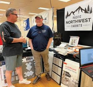 (Clockwise from top) Kilchis Farms owner David Olson displays flowers at the Home & Garden Show. Mark Harvey of Old House Dahlias shows off a handful of Dahlia Tubers. Tillamook County Solid Waste Director David McCall shares information with two showgoers.