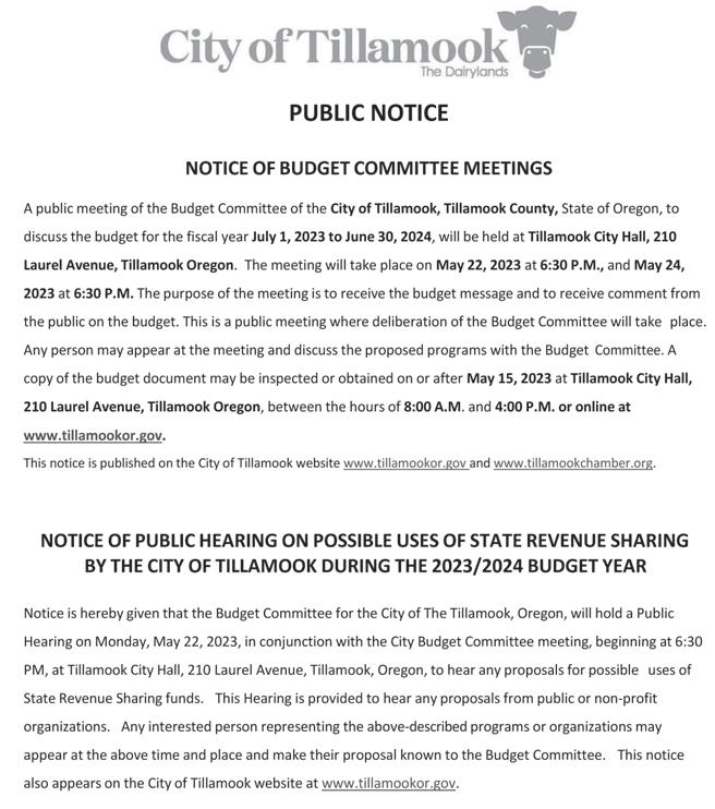 A copy of the budget document may be inspected or obtained on or after May 15, 2023 at Tillamook City Hall, 210 Laurel Avenue, Tillamook OR 97141, between the hours of 8:00 AM and 4:00 PM or at web address www.tillamookor.gov