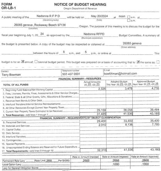 HH24-2048 Notice of Budget Committee Meetings Two public meetings of the Budget Committees of the Garibaldi Urban Renewal Agency (“GURA”), and the City of Garibaldi, Tillamook County, State of Oregon, to discuss the budget for the fiscal year July 1, 2024, to June 30, 2025, will be held at the City of Garibaldi in the Community Hall, located at 107 6th Street, Garibaldi Oregon, and online through Zoom. The first meeting will take place on May 28, 2024, at 4:00 p.m. for GURA, and the City of Garibaldi at 4:30 p.m. The purpose of the first meeting is to receive the budget message and comments from the public on the proposed budget. A public hearing will also be held to discuss the use of State Revenue Sharing. A second meeting is tentatively scheduled for May 29, 2024, at 4:00 p.m. for GURA and the City of Garibaldi at 4:30 p.m. Public Comment for Zoom Meetings: If you wish to provide public comment you must submit it by 4:00 p.m., May 23, 2024, to city@ garibaldi.gov All written comments received by the deadline will be distributed to the committee and the appropriate staff prior to the start of the meeting. The written comments will be included in the record copy of the meeting. You may also request to speak during this Zoom meeting. ZOOM Information: City of Garibaldi and GURA Budget Meeting Meeting ID: 503-322-3327 Via Phone: 253-215-8782 Password: 97118 A copy of the budget document may be inspected or obtained on or after May 21, 2024, online at www.ci.garibaldi.or.us or at City Hall between the hours of 8:30 a.m. and 3:30 p. m. Monday through Thursday.