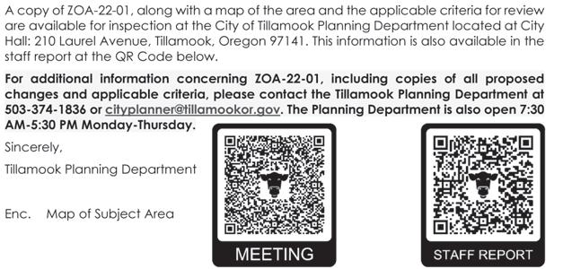 Department of Community Development, ltone@co.tillamook.or.us as soon as possible if you wish to have your comments included in the staff report that will be presented to the Planning Commission. Documents and submitted application are also available on the Tillamook County Department of Community Development website (https://www.co.tillamook. or.us/commdev/landuseapps) or at the Department of Community Development office located at 1510-B Third Street, Tillamook, Oregon 97141. A copy of the application and related materials may be purchased from the Department of Community Development at a cost of 25 cents per page. The staff report will be available for public inspection seven days prior to the hearing. Please contact Lynn Tone for additional information ltone@ co.tillamook.or.us or call 1-800488-8280 x3423. In addition to the specific applicable review criteria, the Tillamook County Land Use Ordinance, Tillamook County Comprehensive Plan and Statewide Planning Goals which may contain additional regulations, policies, zones and standards that may apply to the request are also available for review at the Department of Community Development. The Port of Tillamook Bay Conference Center is accessible to persons with disabilities. If special accommodations are needed for persons with hearing, visual, or manual impairments who wish to participate in the hearings, call 1-800-4888280 ext. 3423 or email ltone@ co.tillamook.or.us at least 24 hours prior to the hearing so that the appropriate communications assistance can be arranged. If you need additional information, please contact Lynn Tone, DCD Office Specialist, at 1-800-4888280 ext. 3423 or email ltone@ co.tillamook.or.us. Tillamook County Department of Community Development Sarah Absher, CFM, Director