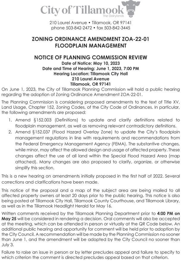 The virtual meeting link can be found on the Community Development Department homepage as well as a dial in number for those who wish to participate via teleconference. Written testimony may be submitted to the Tillamook County Department of Community Development, 1510-B Third Street, Tillamook, Oregon, 97141 prior to 4:00 p.m. on the date of the June 8, 2023, Planning Commission hearing. Testimony submitted by 4:00pm on Tuesday, May 30, 2023, will be included in the packet mailed to the Planning Commission the week prior to the June 8, 2023, hearing. Failure of an issue to be raised in a hearing, in person or by letter, or failure to provide sufficient specificity to afford the decision-maker an opportunity to respond to the issue precludes appeal to the Land Use Board of Appeals on that issue.