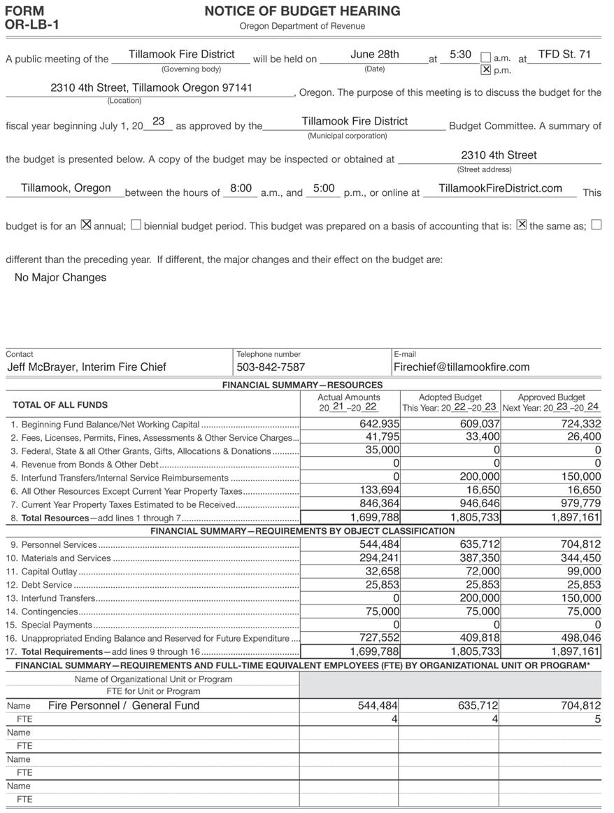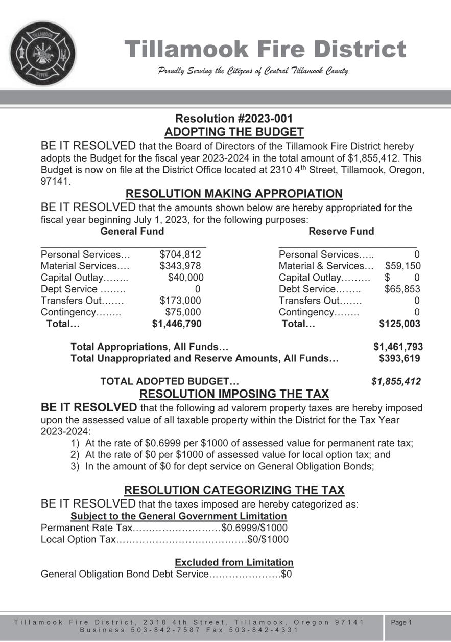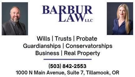 JANEWAY LAW FIRM, LLC, Successor Trustee 1499 SE Tech Center Place, Suite 255, Vancouver, WA 98683 www.logs.com/janeway_ law_firm Telephone: (360) 2602253 Toll-free: 1-800-970-5647 JLF 23-128446 NPP0435285 To: HEADLIGHT HERALD 06/20/2023, 06/27/2023, 07/04/2023, 07/11/2023 Public Notices 999 Public Notices 999 Public Notices 999 Public Notices 999 Public Notices 999 Public Notices 999 www.tillamookheadlightherald.com/subscribe Headlight Herald 503-842-7535 For new and returning subscribers only, offer good through 7/19/23 Purchase a One Year Subscription and receive an additional 3 months for FREE! Just mention this ad SUPER SPECIAL 2507 Main Ave. N. Suite A Tillamook, OR. 97141 KING REALTY KING REALTY All land or lots, offered for sale, improved or unimproved are subject to land use laws and regulations, and governmental approval for any zoning changes or use. VIEW MORE PROPERTIES @ www.KingRealtyBrokers.com (503) 842-5525 www.KingRealtyBrokers.com NEW LISTING PRICEREDUCED PRICEREDUCED H22274 Call Marilyn Hankins, PC, GRI, CRS, Principal Broker @ 503.812.8208 Or Dylan Landolt, Real Estate Broker @ 503.457.8725 Call Patti Tippett, Real Estate Broker @ 503-812-6508 Call Patti Tippett, Real Estate Broker @ 503-812-6508 24695 River Bend Road, Beaver, OR 97108 MLS#23-280 $309,000 Well maintained double wide manufactured home on a .73 acre lot, located in the desirable Nestucca Meadows neighborhood. World class fishing nearby on the Nestucca River! 2 bedrooms and 2 bathrooms, 1152 sqft. A large fenced backyard with a nice workshop and detached 2 car garage for lots of extra storage. The shop is heated with propane and is wired with a 220v outlet. The house has multiple heat sources including a propane fireplace with a battery backup, a heat pump, and an electric forced air furnace. Metal roof with gutter guards installed. The property is served by an on-site septic system and shared well. This property would make for a great full time residence or use it as your vacation home to come enjoy all of the costal activities! Call today to schedule a showing! 4330 Sequoia Loop, Netarts, OR 97143 MLS#23-181 $586,000 Fabulous Netarts Bay and ocean view custom immaculate beach home! Start making your coastal memories today in this amazing move in ready 3 bedroom, 2.5 bath home with a office/4th bedroom, front deck for sunsets, fenced back yard for forest views, deck that backs up to forested green space, and low upkeep yard, providing more beach time, fishing, crabbing, or clamming! Main level provides open floor plan with front and back views, lovely kitchen with SS appliances, dining, living room and den with french doors. A wide stair case leads upstairs to a spacious master suite, and 2 large bedrooms, all with views. Backyard has a hot tub ready pad with hot/ cold shower. Full or part time living and located just 1.5 hours from Portland! This is one not to miss!! 6975 Baseline Road, Bay City, OR 97107 MLS#22-534 $679,000 Custom single level home! This is a must see 3 bedroom 2 bath home! Seller is the original owner and home is well loved and maintained! Featuring a large eat in kitchen, with new SS appliances including an updated induction stove/oven. Kitchen leads into an approx 800 sq ft enclosed patio/bonus room/ equipped with B/I propane BBQ, an open formal dining/living room provides a great gathering place! Main bath has jetted walk in tub/shower. Home is located on a .26 corner lot in the quiet quaint bayside community of Bay City close to Tillamook Bay, rivers, ocean, fishing, crabbing or clamming, you choose! Enjoy being in the country yet only a little over an hour to Portland! Definitely one not to miss! 3606 Alder Lane, Tillamook, OR 97141 MLS#23-191 $399,000 Immaculately maintained single level home in Tillamook with gorgeous mountain views! This 3 bedroom, 2 bathroom, 1,056 sqft home is a great opportunity for a first time homebuyer, starter home or for someone who is just looking to downsize. Paved driveway with a nicely landscaped low maintenance and partially fenced yard. Conveniently located near schools and just a few minutes drive to downtown. The property is served by public sewer and water. Kitchen appliances and all window coverings are included in sale. Home is move in ready! Make an appointment today to come and see all that this home has to offer! Call Dylan Landolt, Real Estate Broker @ 503.457.8725 Or Marilyn Hankins, PC, GRI, CRS, Principal Broker @ 503.812.8208 T.C.C.A. FARM STORE Front & Ivy Tillamook (503) 842-7566 Hwy. 101, Cloverdale (503) 392-3323 Service • Furnaces • Heat Pumps Call, email or stop by the office today to set up an appointment. FREE ESTIMATES! 503-842-7765 “A Tillamook Family Tradition since 1974” Licensed • Bonded • Insured CCB#144376 customerservice@pandlheating.com 2711 3rd Street • Tillamook, OR H43805 ADVERTISE YOUR BUSINESS HERE Call 503-842-7535 or email headlightads@ countrymedia.net for details Cell (503) 812-2520 judysbythesea@gmail.com 1812 3rd St, Tillamook, OR 97141 Judy Sours HomeSource H20145