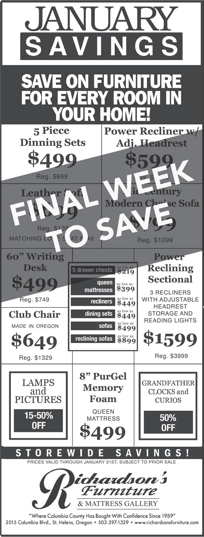 Page 2 Wednesday, January 25, 2023 News Advertiser Columbia County Classifieds Listings are updated daily at thechronicleonline.com and thechiefnews.com Alcoholics Anonymous Info-line, (503) 366-0667 www.pdxaa.org 502 Help Wanted Immediate Opening Sewing Part-time 6-Noon, M-Th. Apply in person only. 33550 SE Santosh St. Scappoose, OR 97056. Support Services Clerk Columbia County, OR EOE. Deadline: Open Until Filled. Apply at ColumbiaCounty OR.gov. Administrative Billing Specialist The City of St. Helens is hiring Administrative Billing Specialist Regular Full-Time Monthly wage: $3,856 (Step 1) Apply online at www.sthelensor egon.gov. Deadline to Apply: 02/10/23 Equal Opportunity Employer. 712 Furniture For sale Couch with recliner on each end. Love seat with recliner on each end w/ cup holder. Like new, $500 each. Cash only. Please call 503-397-0643. Waterman Garage DoorsCCB#204858 SALES, SERVICE INSTALLATION 503.819.6715 St. Helens, OR 97051 Scott Waterman Owner Advertise your business in the Business & Service Directory. Call 503-397-0116 for more information YOUR AD HERE Columbia County BUSINESS & SERVICE DIRECTORY www.thechronicleonline.com Get your ad in the paper and reach out to potential customers. Call 503-397-0116 to place your ad in the newspaper and online. Garage Sale Special! Advertise your garage sale in the paper and online for only $10 for up to 14 lines! Email chronicleclassifieds@countrymedia.net to advertise! 502 Help Wanted 502 Help Wanted 301 Health & Nutrition Send subscription info to PO Box 1153, St. Helens OR 97051 Card No. __________________________________________ Exp. Date _________________ Name ______________________________________________________________________ Address ____________________________________________________________________ City __________________________________ State ________________ Zip _____________ Phone Number ______________________________________________________________ Enclosed is my check for $70.00 Bill my VISA/Mastercard Subscribe me to the: The Chronicle The Chief $70 a year in Columbia County, $90 a year for outside county SUBSCRIBE TO YOUR FAVORITE LOCAL COUNTY NEWSPAPER AND GET FREE ACCESS TO ONLINE NEWS Let Us Know What YOU Think. Have an Opinion on Current Events? EMAIL YOUR LETTERS TO: CHRONICLENEWS@COUNTRYMEDIA.NET thechronicleonline.com The Chronicle Reach local readers by advertising in The Chronicle’s online classifieds section. Call 503-397-0116 for more information. Advertise online