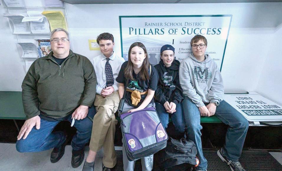 The Rainier Jr/Sr High School History Bowl Team, let to right, advisor Andy Demko, Joseph Bach, Alora Jefferson, Logan Goddard, and Teancum Tygret.