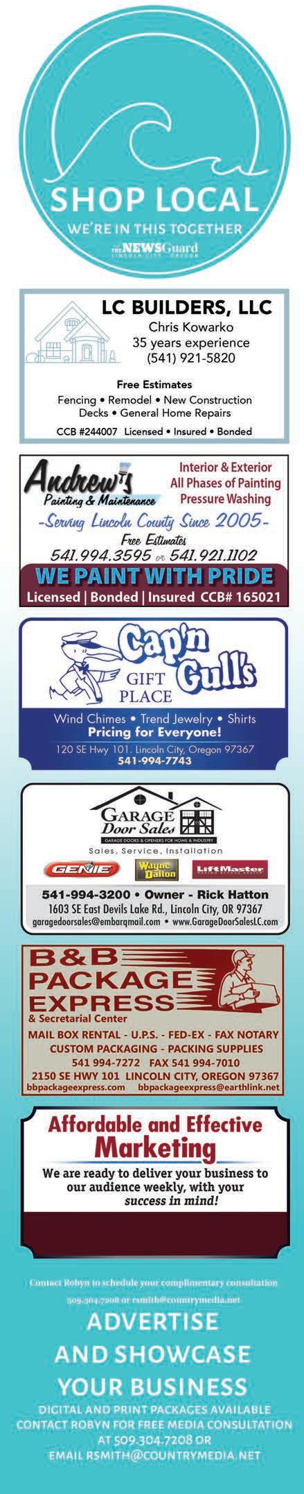 Honoring our heroes PAGE 6 Coastal Cheer seeks new members PAGE 11 May 23, 2023 Lincoln City’s Largest and Most Trusted News Source Since 1927 $1.50 Police Blotter 3 Opinion 5 Classifieds 7 Sports ...................... 12 INDEX WEATHER TheNewsGuard.com WED. THU. FRI. SAT. SUN. MON. TUE. 58 /48 59 /50 59 /50 56 /49 58 /50 56 /47 VOL. 96 NO. 21