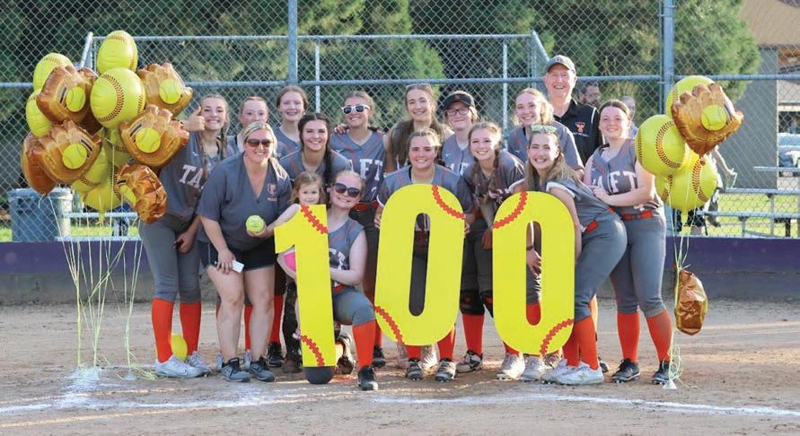 Taft High School’s softball Head Coach Sandy Stuart won her 100th game as a coach with the Tigers’ resounding 24-12 victory over Jefferson on April 28.