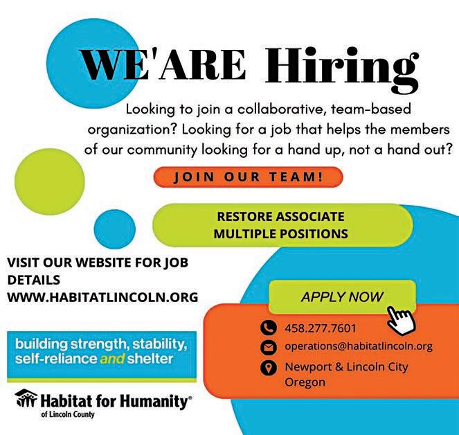 Sail Away Registration is now open for the Yaquina Bay Yacht Club’s adult sailing class. Space is limited to 12 student. Those interested need to register and pay to hold a spot. Class dates are Aug 3-22. Tuesday and Thursday evenings, plus Saturday, Aug 5, and are taught in the club’s fleet of 420 dinghies. More more information, visit https://yaquinabayyachtclub. org/adult-small-boat-sailing