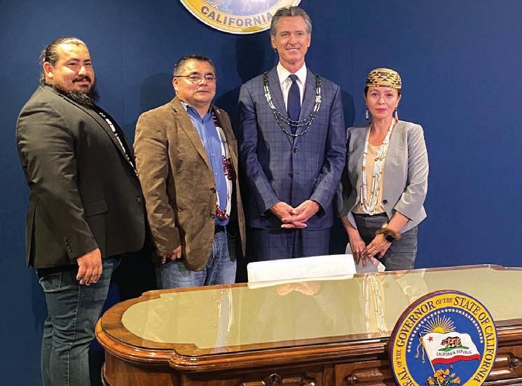 Yurok Chairman Joseph L. James, Vice Chairman Frankie Myers and Yurok Chief Operating Officer Taralyn Ipina join California Gavin Newsom and Assemblymember James C. Ramos for the signing of the historic Feather Alert bill.