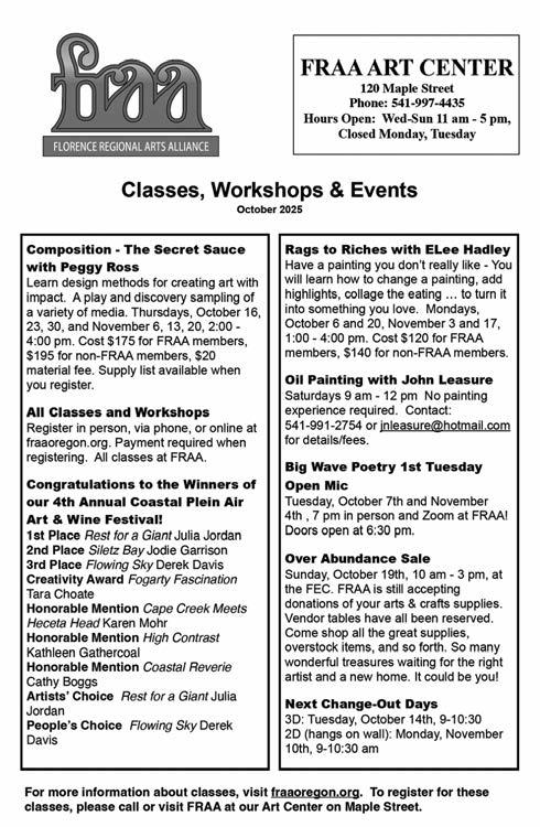 and collect community input. To learn more about the city’s efforts on evaluating and preparing STR regulations and see the community’s survey results on STR, visit: ci.florence.or.us/ planning/short-term-rental-housing-resources. The Short-Term Rental Housing regulation project was identified as a need in the Housing and Economic Opportunities Project completed in 2018. These project plans and materials are available by visiting the City’s project webpage: https://www.ci.florence.or.us/ planning/housing-and-economic-opportunitiesproject-completed-nov-2018. If you have any questions, please contact Management Analyst Peighton Allen at (541) 997-3437 or peighton.allen@ci.florence.or.us. Those interested in attending the event can find out more at https://bit.ly/FlorenceSTR.