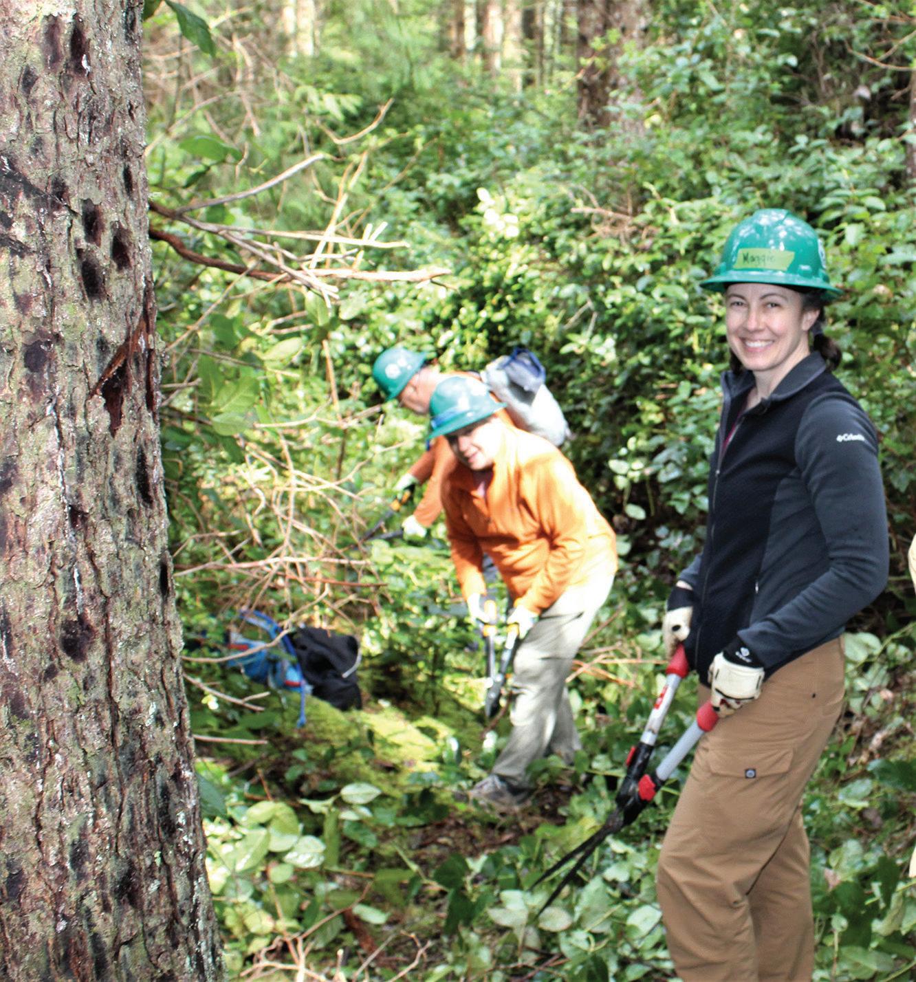 A group of volunteers lined up along the Bog Trail, tools in hand, just outside Sunset Bay Campground on Saturday, April 22. They clipped and trimmed plants spreading onto the walkway, raked