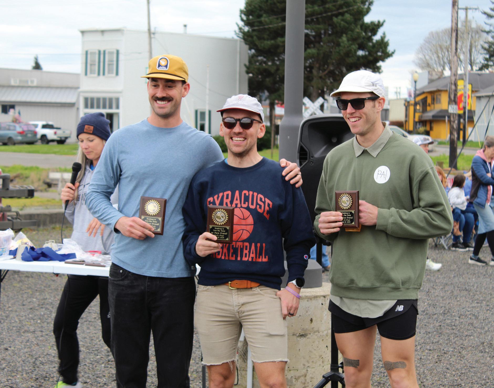 Winning team: South Coast running Club members Kevin Brightbill, Brad Harbart and Derek McGargil won the Roseburg to Coos Bay Relay with a time of 8 hours and 5 minutes.