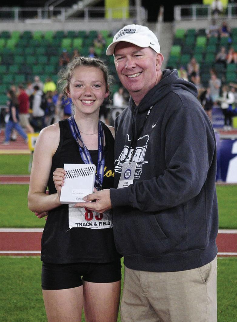 Bandon’s Marley Petrey accepts her athlete of the meet award from OSAA Executive Director Peter Weber.