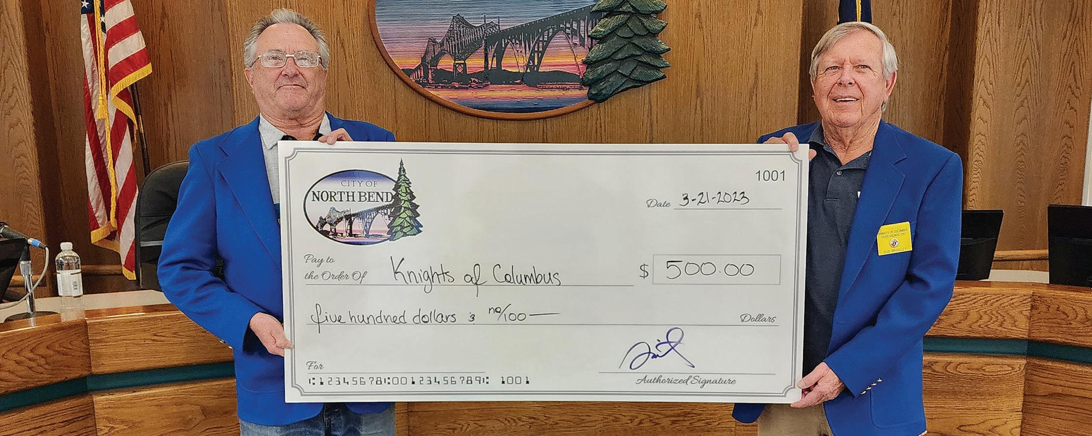 The Knights of Columbus (Chapter 1261) was recently awarded a $500 grant for community services. The funds will be used to purchase perishable and non-perishable food to be placed in the holiday food baskets program. Baskets are distributed to men, women, and children needing essential daily nutrition during Christmas. The North Bend City Council annually awards limited funds via