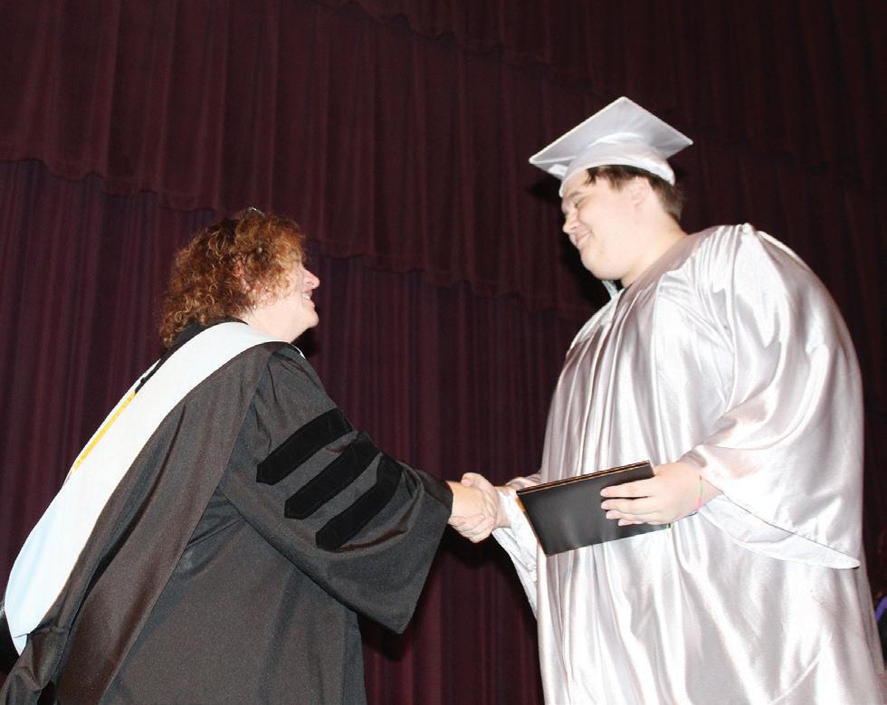 Destinations graduate Ashton Beltran is congratulated by Coos Bay Schools Superintendent Charis McGaughy.