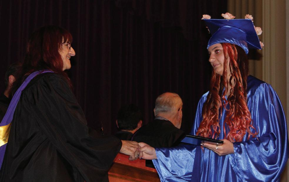 Resource Link graduate Savannah Key is congratulated by Lisa DeSalvio, director of special programs for Coos Bay School District.