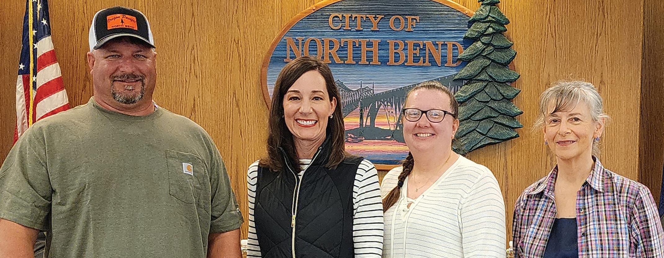 Last week, North Bend City Recorder Maycie Jaehnig administered the Oath of Office to newly-appointed Council Member Matt Hamilton. He will fill the unexpired term of Dr. Eric Gleason, who resigned from his post upon moving out of the city limits. Pictured from left to right: Councilor Hamilton, Mayor Jessica Engelke, Councilor Barbara Schultz, and Councilor Susanna Noordhoff.