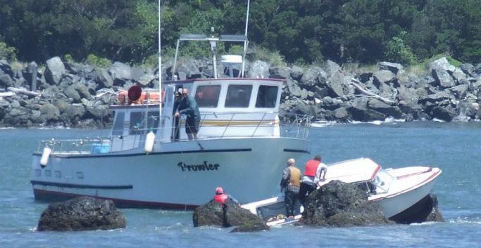 Wayne Butler moves his boat close to a boat that became stranded in the rocks. Butler was able to rescue the three men in the boat.